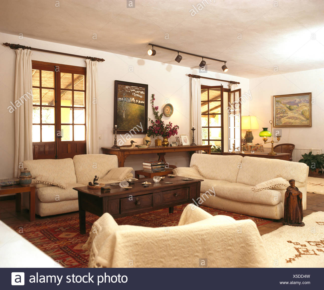 Cream Sofas And Dark Wood Coffee Table In Living Room Of Spanish