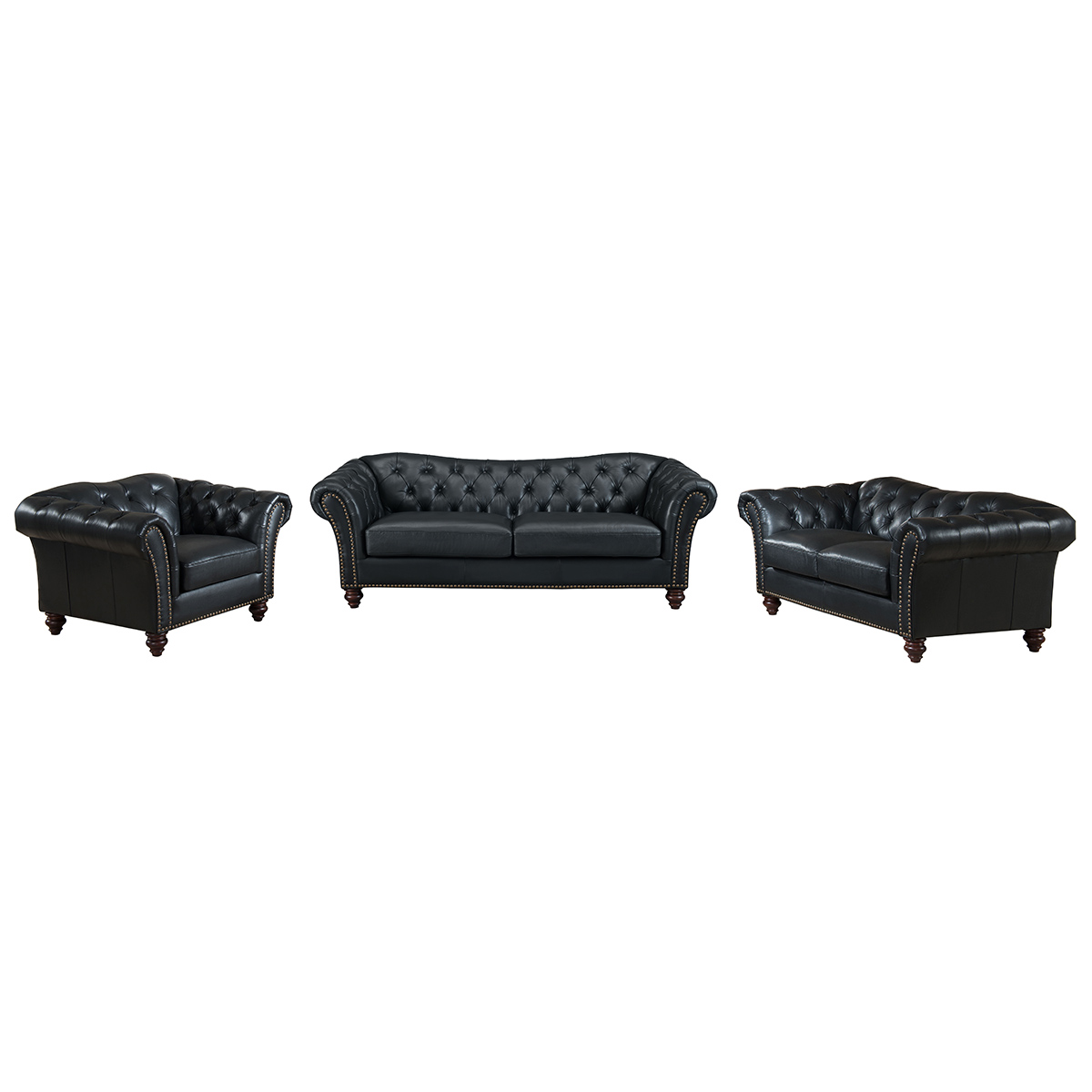 2 Pcs Tufted Back Wood Legs Black Top Grain Leather Sofa Loveseat Set