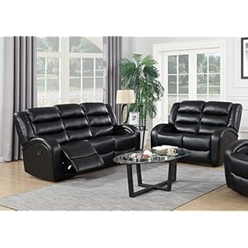 Contemporary Leather Sofa Loveseat Set 2 Pc Black Reclining Sofa